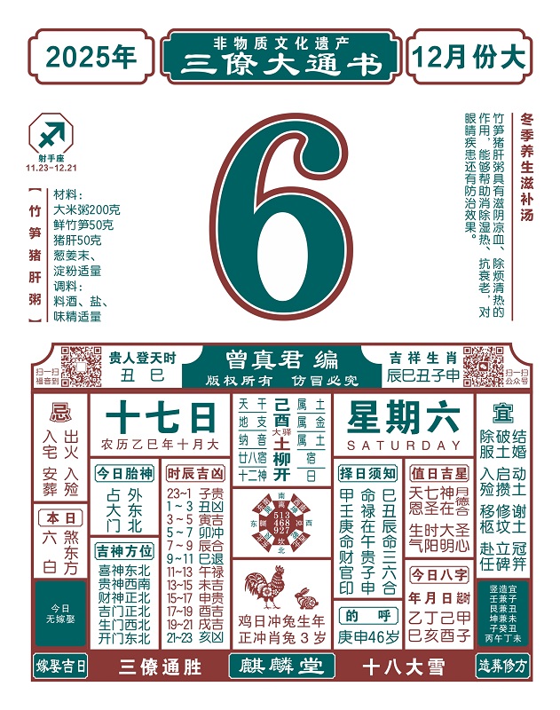 2025年岁次乙巳,农历十月十七,新历2025年12月6日,星期六,日柱己酉,本日冲兔,煞在东,寅甲卯乙辰,丑巳贵人登天时。