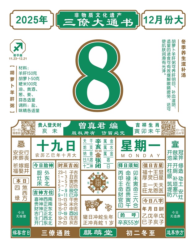 2025年岁次乙巳,农历十月十九,新历2025年12月8日,星期一,日柱辛亥,本日冲蛇,煞在西,申庚酉辛戌,亥未贵人登天时。