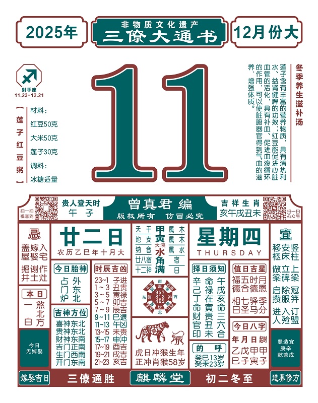 2025年岁次乙巳,农历十月廿二,新历2025年12月11日,星期四,日柱甲寅,本日冲猴,煞在北,亥壬子癸丑,午子贵人登天时。