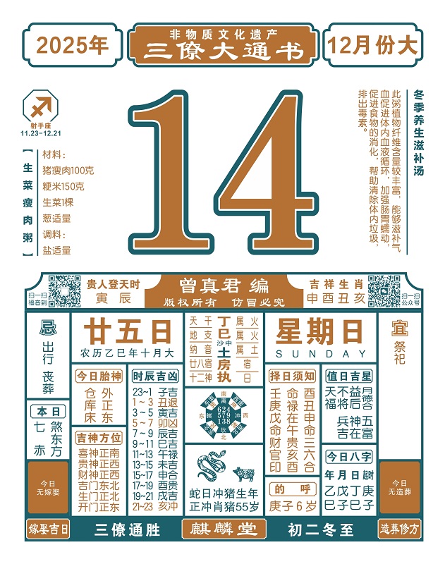 2025年岁次乙巳,农历十月廿五,新历2025年12月14日,星期日,日柱丁巳,本日冲猪,煞在东,寅甲卯乙辰,寅辰贵人登天时。