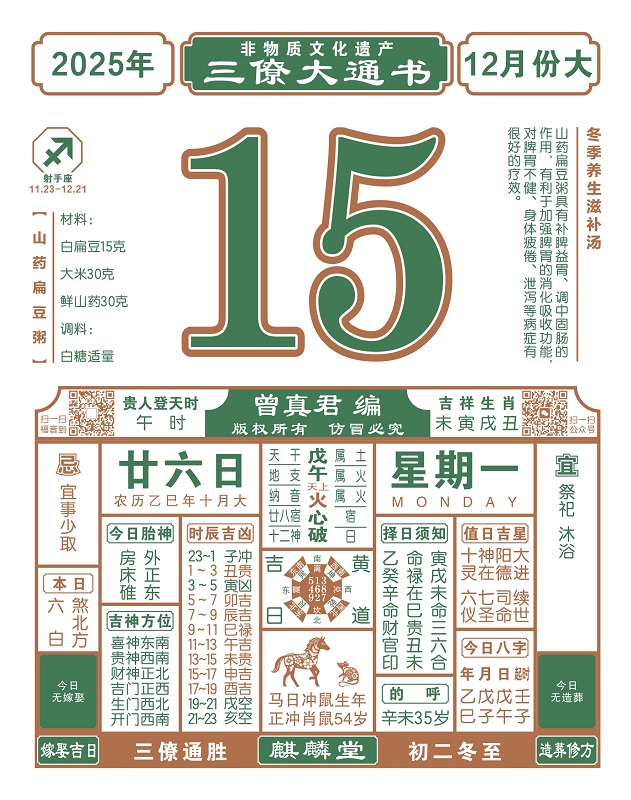 2025年岁次乙巳,农历十月廿六,新历2025年12月15日,星期一,日柱戊午,本日冲鼠,煞在北,亥壬子癸丑,午时贵人登天时。