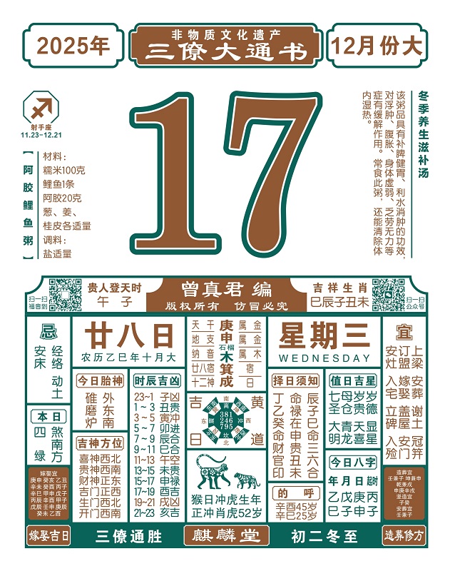 2025年岁次乙巳,农历十月廿八,新历2025年12月17日,星期三,日柱庚申,本日冲虎,煞在南,巳丙午丁未,子午贵人登天时。