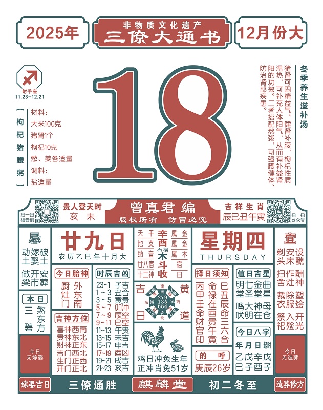 2025年岁次乙巳,农历十月廿九,新历2025年12月18日,星期四,日柱辛酉,本日冲兔,煞在东,寅甲卯乙辰,亥未贵人登天时。