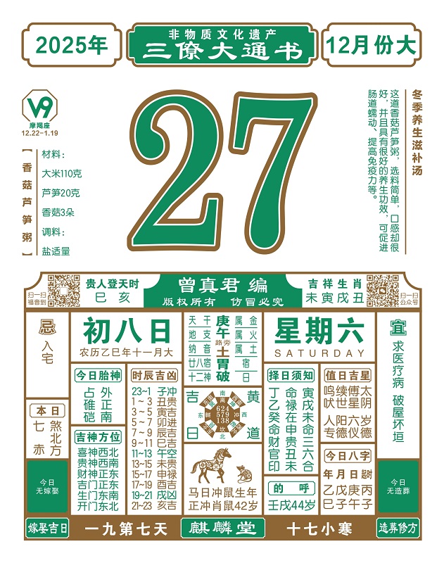 2025年岁次乙巳,农历十一月初八,新历2025年12月27日,星期六,日柱庚午,本日冲鼠,煞在北,亥壬子癸丑,巳亥贵人登天时。