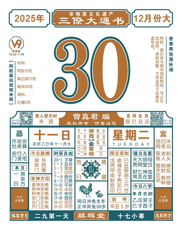 2025年岁次乙巳,农历十一月十一,新历2025年12月30日,星期二,日柱癸酉,本日冲兔,煞在东,寅甲卯乙辰,未酉贵人登天时。