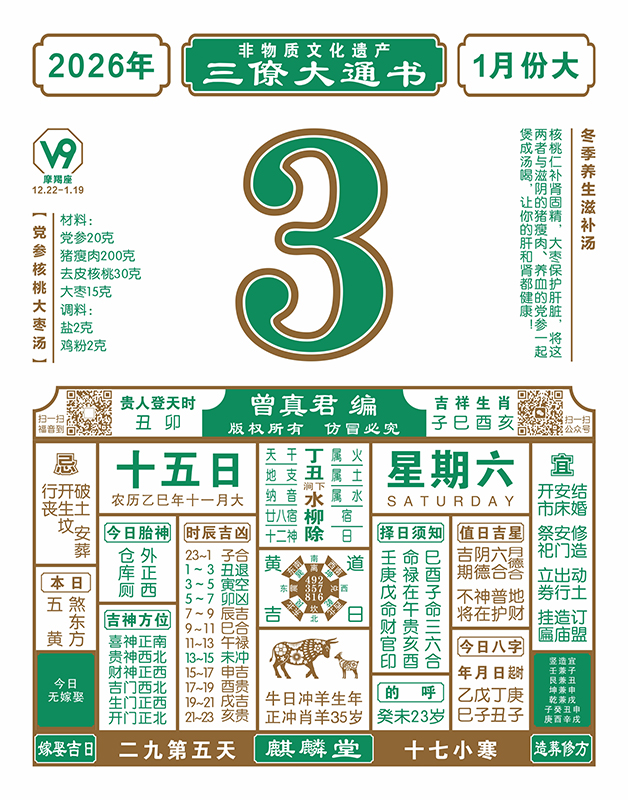2025年岁次乙巳,农历十一月十五,新历2026年1月3日,星期六,日柱丁丑,本日冲羊,煞在东,寅甲卯乙辰,丑卯贵人登天时。
