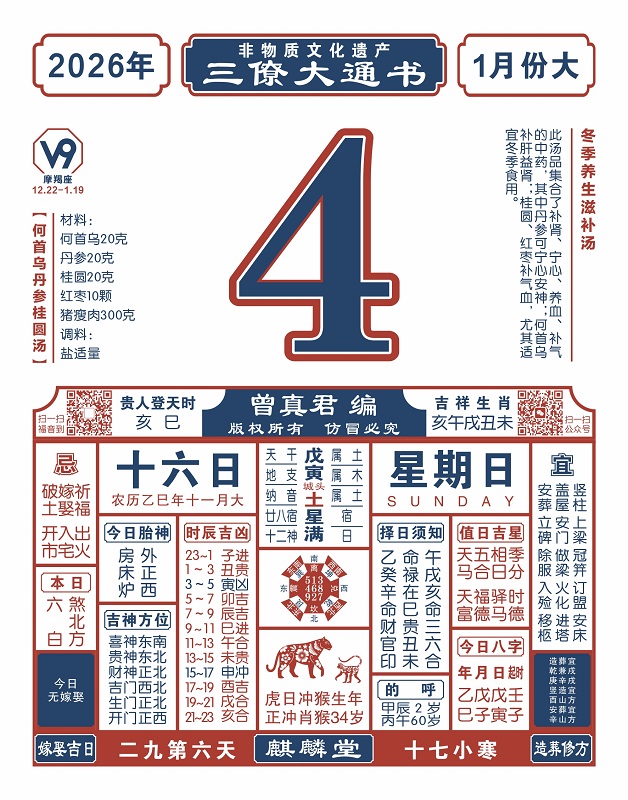 2025年岁次乙巳,农历十一月十六,新历2026年1月4日,星期日,日柱戊寅,本日冲猴,煞在北,亥壬子癸丑,亥巳贵人登天时。