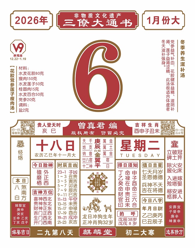 2025年岁次乙巳,农历十一月十八,新历2026年1月6日,星期二,日柱庚辰,本日冲狗,煞在南,巳丙午丁未,亥巳贵人登天时。