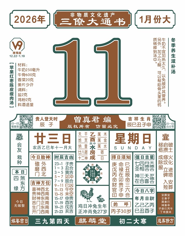 2025年岁次乙巳,农历十一月廿三,新历2026年1月11日,星期日,日柱乙酉,本日冲兔,煞在东,寅甲卯乙辰,辰子贵人登天时。