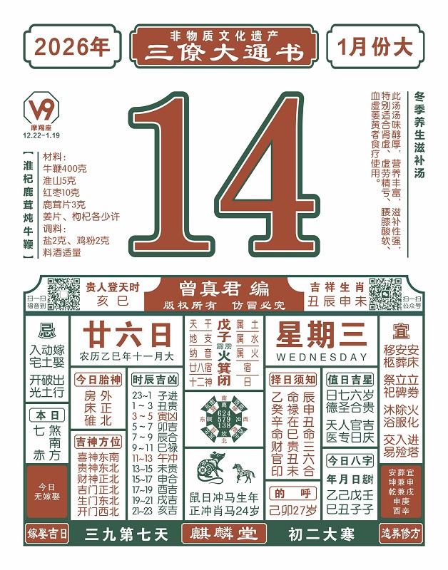 2025年岁次乙巳,农历十一月廿六,新历2026年1月14日,星期三,日柱戊子,本日冲马,煞在南,巳丙午丁未,亥巳贵人登天时。