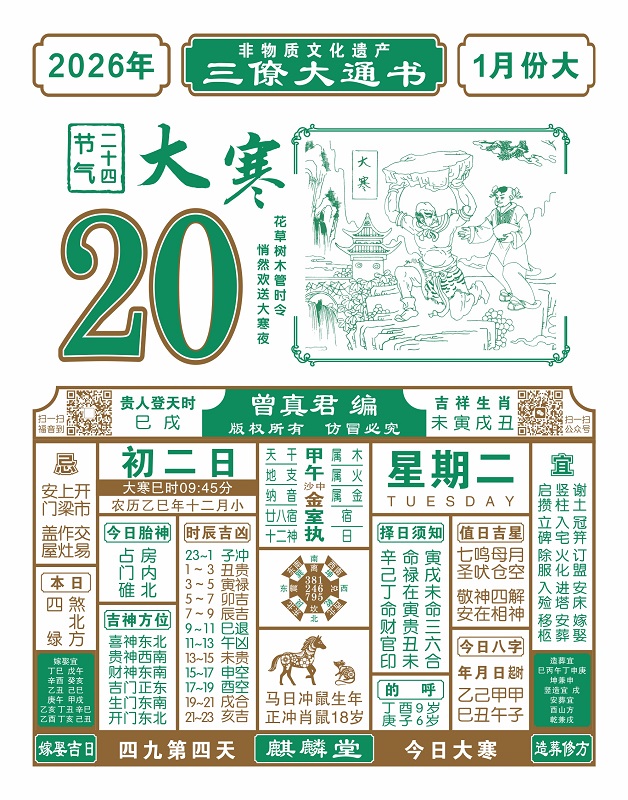 2025年岁次乙巳,农历十二月初二,新历2026年1月20日,星期二,日柱甲午,本日冲鼠,煞在北,亥壬子癸丑,巳戌贵人登天时。