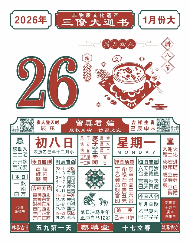 2025年岁次乙巳,农历十二月初八,新历2026年1月26日,星期一,日柱庚子,本日冲马,煞在南,巳丙午丁未,辰戌贵人登天时。
