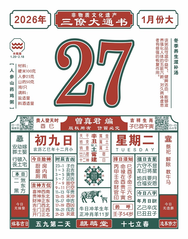 2025年岁次乙巳,农历十二月初九,新历2026年1月27日,星期二,日柱辛丑,本日冲羊,煞在东,寅甲卯乙辰,酉巳贵人登天时。