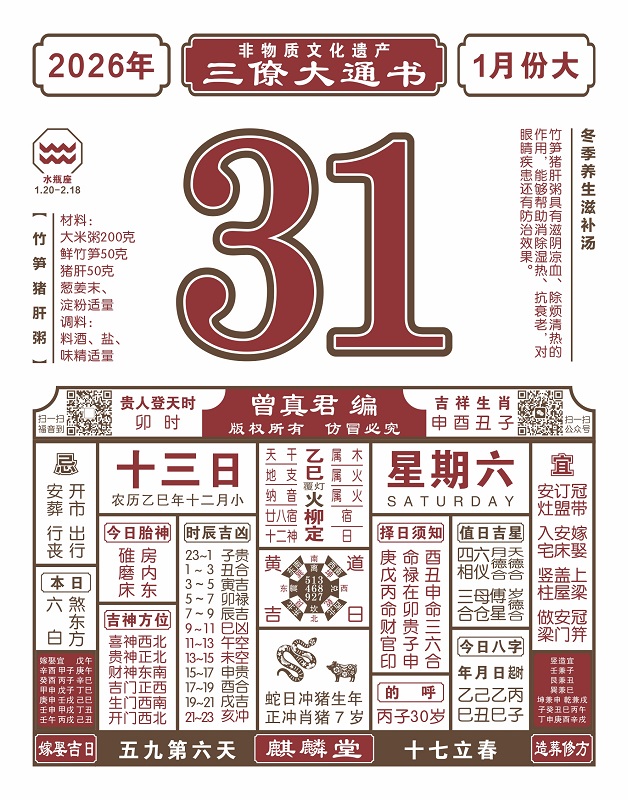 2025年岁次乙巳,农历十二月十三,新历2026年1月31日,星期六,日柱乙巳,本日冲猪,煞在东,寅甲卯乙辰,卯时贵人登天时。