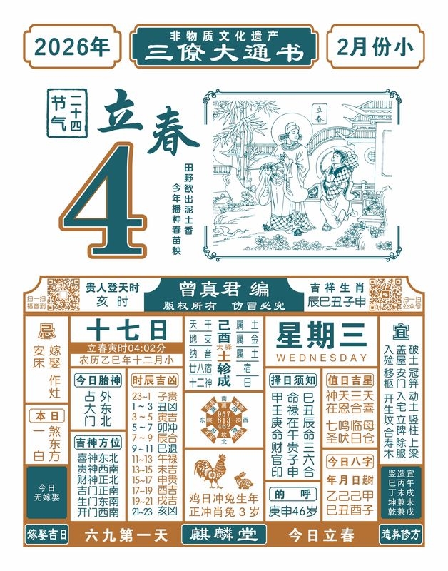 2025年岁次乙巳,农历十二月十七,新历2026年2月4日,星期三,日柱己酉,本日冲兔,煞在东,寅甲卯乙辰,亥时贵人登天时。
