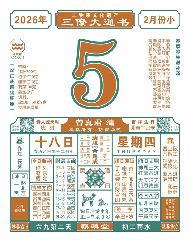 2025年岁次乙巳,农历十二月十八,新历2026年2月5日,星期四,日柱庚戌,本日冲龙,煞在北,亥壬子癸丑,戌时贵人登天时。