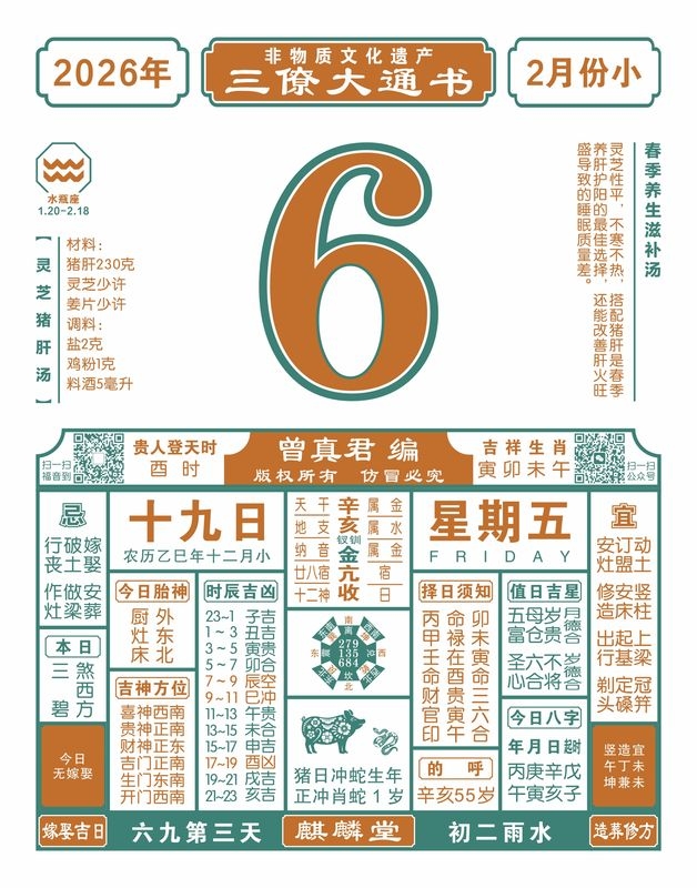 2025年岁次乙巳,农历十二月十九,新历2026年2月6日,星期五,日柱辛亥,本日冲蛇,煞在西,申庚酉辛戌,酉时贵人登天时。