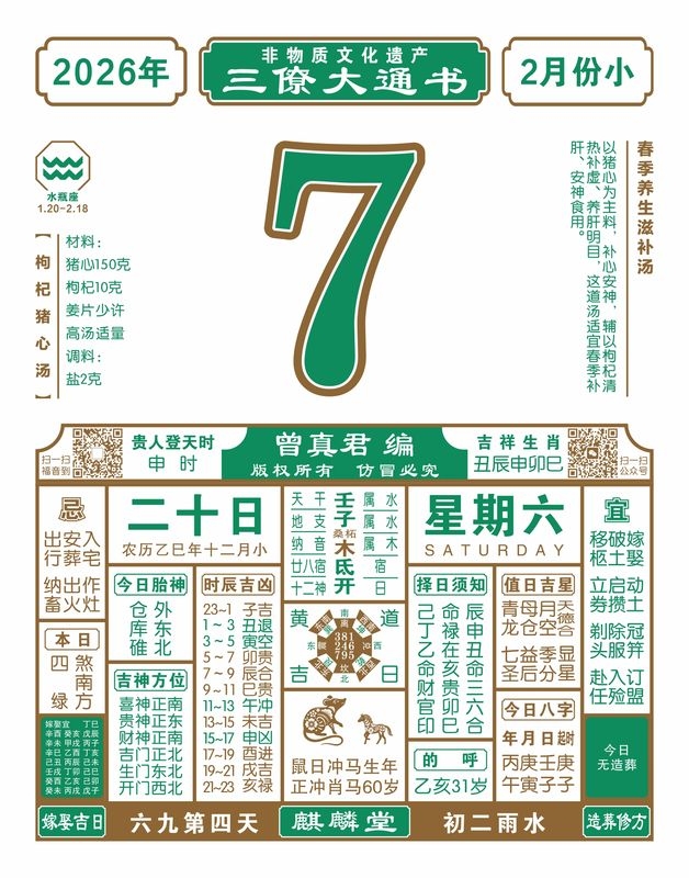 2025年岁次乙巳,农历十二月二十,新历2026年2月7日,星期六,日柱壬子,本日冲龙,煞在南,巳丙午丁未,申时贵人登天时。