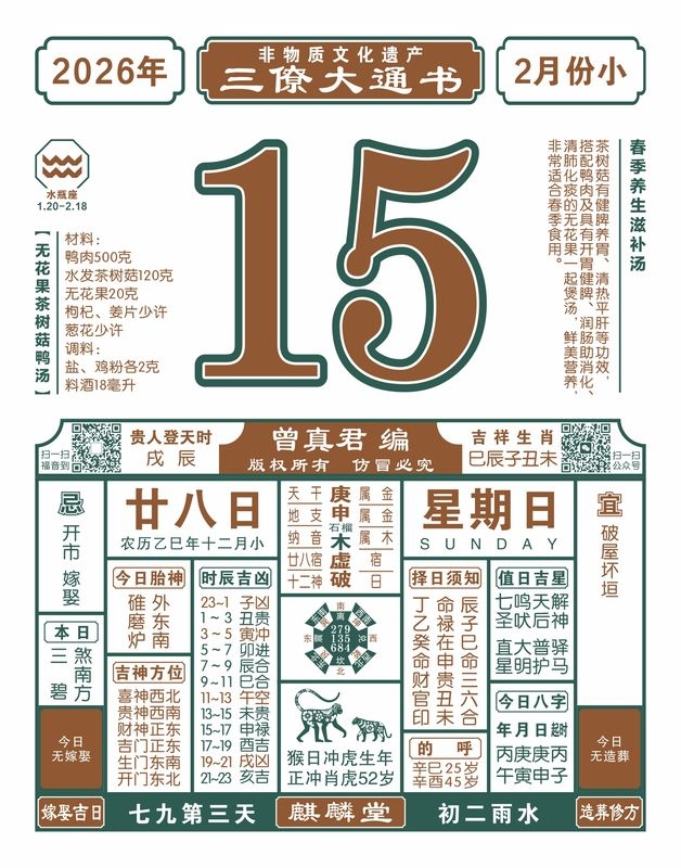 2025年岁次乙巳,农历十二月廿八,新历2026年2月15日,星期日,日柱庚申,本日冲虎,煞在南,巳丙午丁未,戌辰贵人登天时。