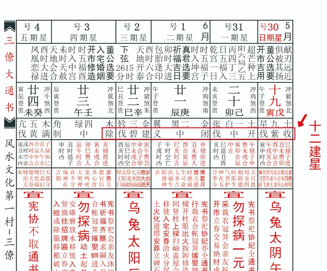 破:黑道。此日万事不利,只能做破垣坏屋之事。此日为与月令地址相冲之日,冲则破,破则败,不破不立,无败无成,失败乃成功之母,故此日虽为黑道,但适宜破旧与反思。危:黄道。此日万事皆凶。此为对“危”字的误解所致,危,本为“高”的意思,高则有险,故有“危险”之说,然而,“高”乃出人头地、出类拔萃也,故为黄道之日。成:黄道。此日宜开业入学、婚姻嫁娶、赴官上任等,但不利诉讼。我们常说:学业有成、成双成对、事业有成,这是人们对人生、少年、青年、壮年三个不同时期的美好祝愿,故,“成”日宜开业入学、婚姻嫁娶、赴官上任等。已成定局的事实是不需要在诉讼的,故“成”日不利诉讼。收:黑道。此日有利于收获之事,开始的事业则不利,忌出行、葬礼。出行危许多事情的起点,往往意味着诸多的开始,而葬礼是活人为死者送行,故“收”日忌出行、葬礼。开:黄道。此日万事皆吉,但破土安葬等则凶。追求永无止境,人生在世就是在一次又一次的“开始”中度过,直至入土方歇,故“开”日万事皆吉,但破土安葬则凶。闭:黑道。此日万事皆凶,但修筑堤防之类的事则吉。有开就有闭,新的创业需要闭门修正策划,以便新的开创更为理想,休整谋划时期,最忌乘虚偷袭,故要筑堤修坝、加强防御,故“闭”日利于闭门思过、运筹帷幄、修筑堤坝等。十二建除择日的排法,是以月建开始排起。如农历正月建寅,就是以正月第一个寅日为建,次日为除,再次日为满,以此类推。农历二月建卯,就以二月第一个卯日为建,次日为除,再次日为满以此类推。三月辰日起建,四月巳日起建,五月午日起建,六月未日起建,七月申日起建,八月酉日起建,九月戌日起建,十月亥日起建,十一月子日起建,十二月丑日起建。